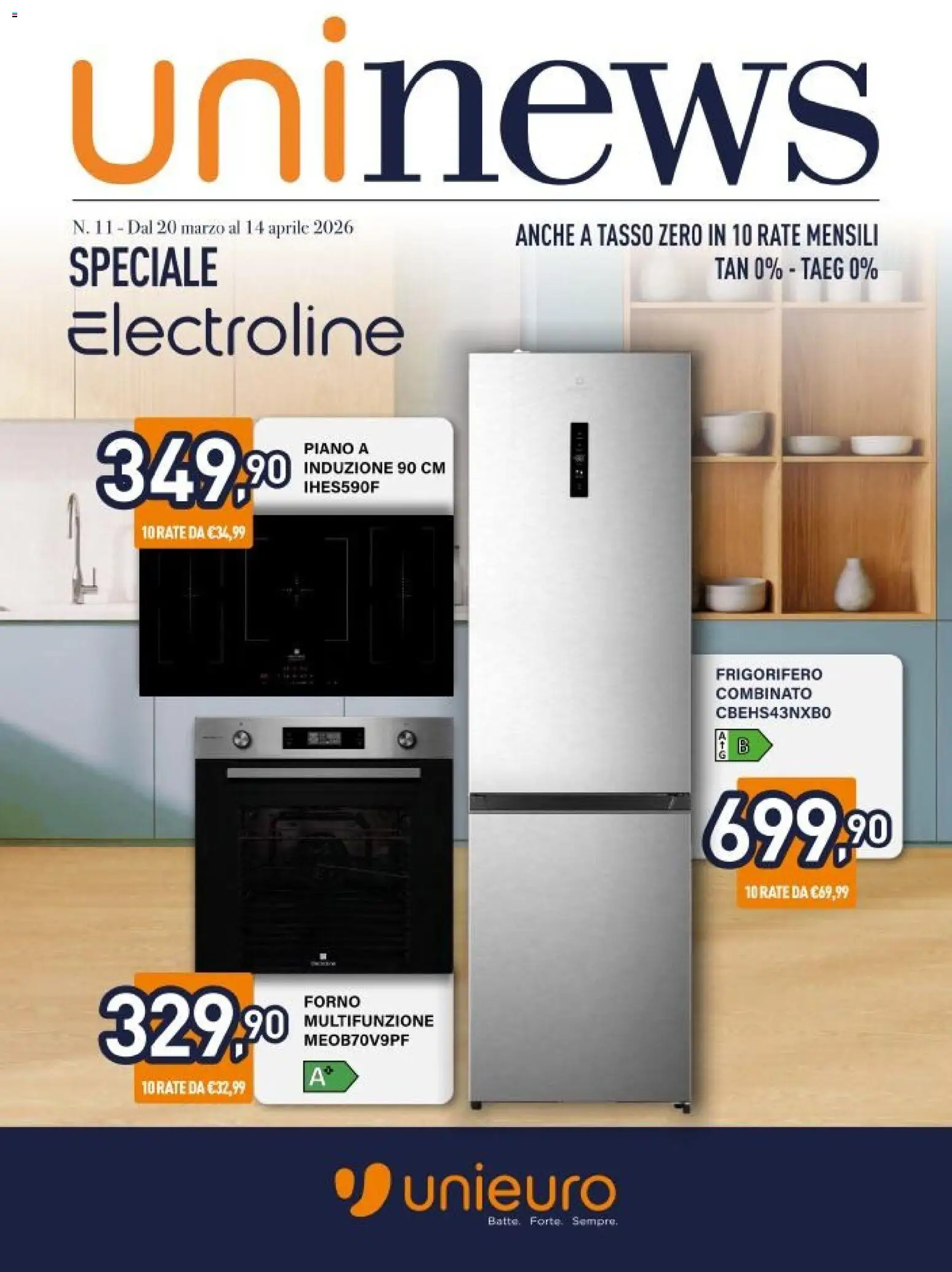 {"147718":[{"boxes":[{"content":"uninews","coord":[[53,21],[716,24],[715,159],[52,158]]},{"content":"SPECIALE","coord":[[52,199],[178,198],[178,236],[52,237]]},{"content":"ANCHE A TASSO ZERO IN 10 RATE MENSILI","coord":[[416,178],[715,177],[715,202],[416,202]]},{"content":"Electroline","coord":[[53,243],[332,243],[333,294],[53,295]]},{"content":"PIANO A","coord":[[245,358],[301,358],[301,369],[245,369]]},{"content":"INDUZIONE 90 CM","coord":[[244,373],[363,373],[363,387],[244,388]]},{"content":"FRIGORIFERO","coord":[[580,541],[670,541],[670,554],[580,554]]},{"content":"COMBINATO","coord":[[581,558],[661,557],[661,569],[581,570]]},{"content":"CBEHS43NXBO","coord":[[581,573],[676,573],[676,586],[581,586]]},{"content":"FORNO","coord":[[245,809],[296,808],[296,820],[245,821]]},{"content":"MULTIFUNZIONE","coord":[[245,823],[354,823],[354,837],[245,837]]},{"content":"MEOB70V9PF","coord":[[245,840],[334,839],[335,852],[245,853]]},{"content":"unieuro","coord":[[326,945],[501,945],[501,989],[326,989]]},{"content":"Batte. Forte. Sempre.","coord":[[395,987],[504,987],[504,1000],[395,1000]]}]}]}Le promozioni sono valide dal 20/03/2026 - 14/04/2026, ma fai attenzione: gli sconti sono limitati nel tempo e i prodotti più richiesti potrebbero terminare presto. Non perdere l’occasione di scoprire cosa Unieuro ha preparato per te questa settimana: prezzi imbattibili e qualità garantita!