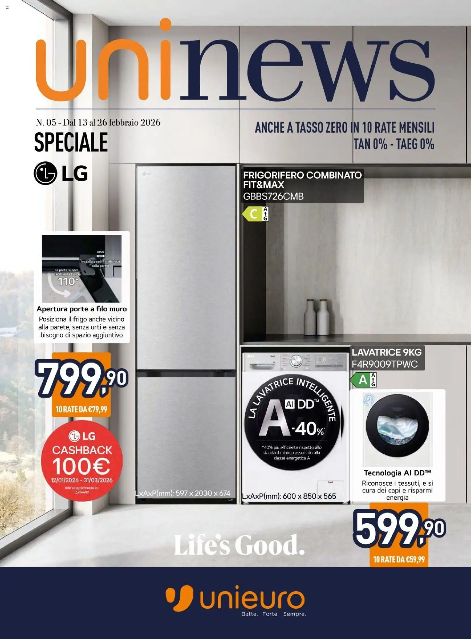 {"142517":[{"boxes":[{"content":"Uninews","coord":[[54,46],[715,56],[713,171],[54,169]]},{"content":"SPECIALE","coord":[[52,214],[178,214],[179,250],[52,252]]},{"content":"ANCHE A TASSO ZERO IN 10 RATE MENSILI","coord":[[417,196],[715,195],[715,222],[417,222]]},{"content":"FRIGORIFERO COMBINATO","coord":[[399,280],[595,279],[595,296],[399,296]]},{"content":"FIT&MAX","coord":[[399,297],[468,297],[468,310],[399,311]]},{"content":"4 0","coord":[[440,339],[441,363],[433,363],[432,340]]},{"content":"Installa a soli 4 millimetri","coord":[[131,427],[197,427],[197,433],[131,433]]},{"content":"dalla parete","coord":[[149,434],[180,435],[180,440],[149,439]]},{"content":"La porta si apre","coord":[[88,441],[129,441],[129,447],[88,447]]},{"content":"facilmente fino","coord":[[89,448],[132,448],[132,453],[89,454]]},{"content":"Apertura porte a filo muro","coord":[[58,502],[209,501],[209,516],[58,516]]},{"content":"Posiziona il frigo anche vicino","coord":[[62,519],[205,519],[205,531],[62,531]]},{"content":"alla parete, senza urti e senza","coord":[[62,533],[205,533],[205,544],[62,544]]},{"content":"bisogno di spazio aggiuntivo","coord":[[63,546],[202,546],[202,558],[63,558]]},{"content":"NTELLIGENTE","coord":[[505,617],[561,680],[545,697],[487,630]]},{"content":"LA LAVATRICE","coord":[[405,677],[454,618],[473,630],[417,695]]},{"content":"CASHBACK","coord":[[86,731],[185,731],[185,749],[86,749]]},{"content":"standard minimo associato alla","coord":[[430,741],[527,741],[527,748],[430,749]]},{"content":"classe energetica A","coord":[[449,750],[510,750],[510,758],[449,758]]},{"content":"Tecnologia AI DD\u2122","coord":[[597,772],[708,770],[708,783],[598,785]]},{"content":"Riconosce i tessuti, e si","coord":[[595,789],[714,789],[714,801],[595,801]]},{"content":"Info e regolamento su","coord":[[106,800],[163,800],[163,806],[106,805]]},{"content":"Ig.commin","coord":[[122,807],[146,807],[146,812],[122,813]]},{"content":"cura dei capi e risparmi","coord":[[595,802],[713,802],[713,814],[595,813]]},{"content":"energia","coord":[[633,814],[675,814],[675,824],[633,825]]},{"content":"Life's Good.","coord":[[283,874],[499,874],[499,917],[283,917]]},{"content":"unieuro","coord":[[327,961],[500,961],[500,1006],[327,1006]]},{"content":"Batte. Forte. Sempre.","coord":[[395,1005],[503,1005],[503,1016],[395,1017]]}]}]}Le promozioni sono valide dal 13/02/2026 - 26/02/2026, ma fai attenzione: gli sconti sono limitati nel tempo e i prodotti più richiesti potrebbero terminare presto. Non perdere l’occasione di scoprire cosa Unieuro ha preparato per te questa settimana: prezzi imbattibili e qualità garantita!